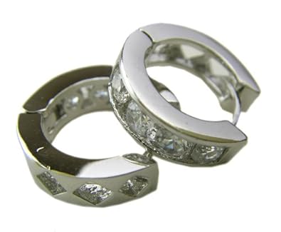 Silver finish hoop earrings feature a single row of simulated diamonds