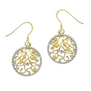 These ornate round medallion earrings will make any outfit fancy. Crafted in textured gold-dipped sterling silver, they have an openwork scroll design, with silver rhodium for contrast and a small diamond accent. The earrings dangle and sway beneath elegant french hooks.